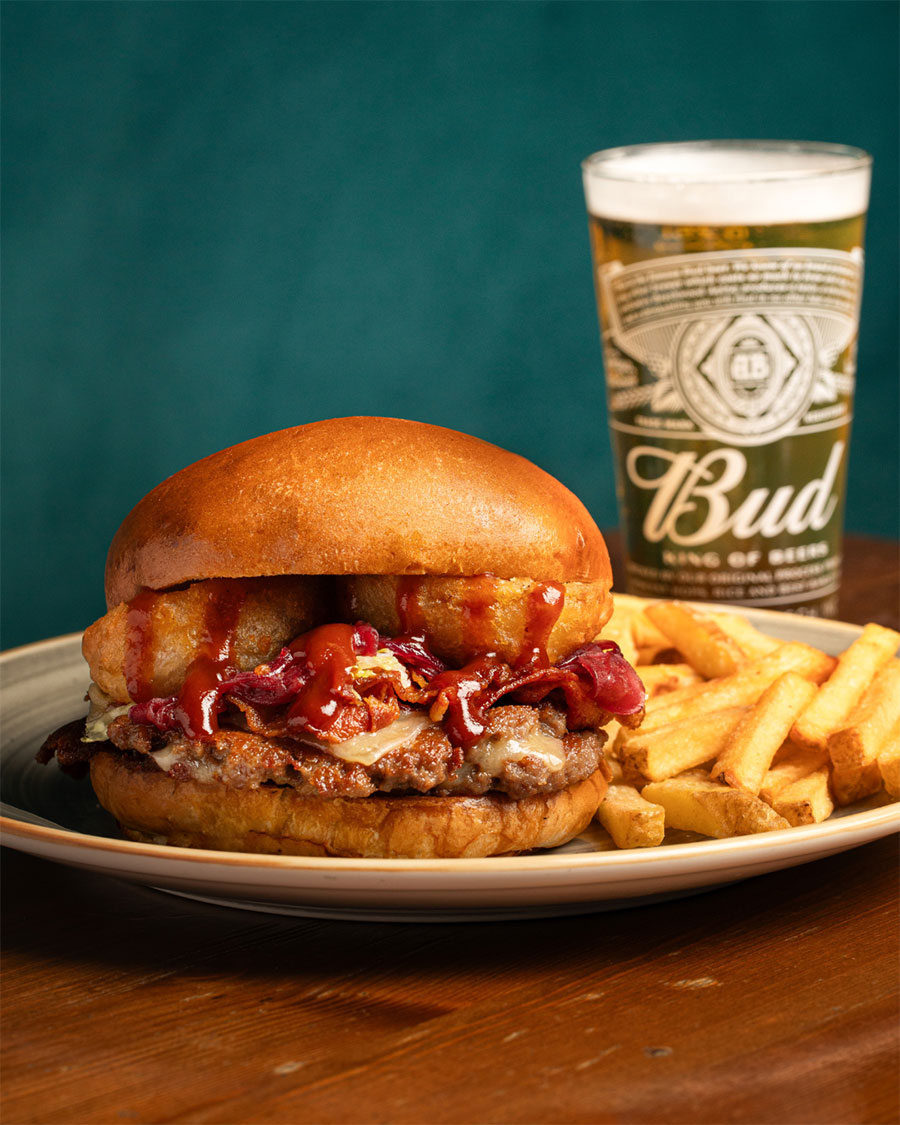 Due patty smashed da 200g, monterey jack cheese, cipolla caramellata, bacon croccante, onion ring, iceberg e salsa American BBQ.
