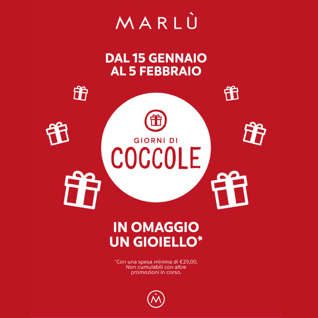 Dal 15 gennaio 2026 al 5 febbraio 2026 con una spesa minima di € 29,00 ricevi in omaggio un gioiello Marlù!